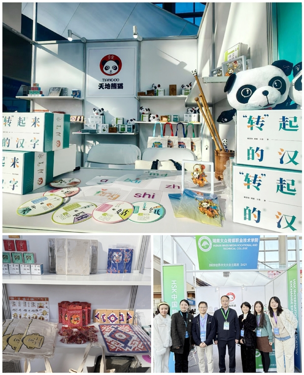 At the exhibition, HNMMC showcased the "Tiandi Panda" Chinese teaching resource package, the Chinese teaching aids "Turning Chinese Characters" and "Pinyin Learning Cards", as well as the Mawangdui cultural creative series products designed by our Digital Media Art Design Program Cluster in collaboration with the Hunan Museum. Deputy Director of the Hunan Provincial Department of Education, Zhu Zhenghua, visited the exhibition area and highly recognized HNMMC's innovative practice in integrating cultural heritage with international Chinese language education. He encouraged the team to continue refining the products and, through the international platform of the World Chinese Language Conference, to bring more high-quality results to the global stage, injecting diverse vitality into the development of international Chinese language education.